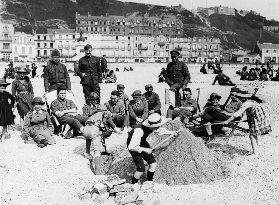 Read moreDuring downtime, soldiers from Britain, France and the USA, plus some members of the Women's Auxiliary Army Corps (WAAC) watch French children playing in the sand, in France, during World War I. #