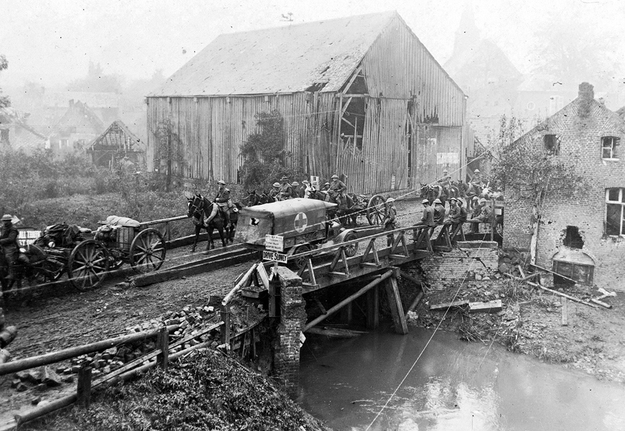 Read moreScene at the French town of Barastre during World War I. Shows a bridge over the river Selle, built by New Zealand engineers in 13 hours under shell fire. An ambulance and mounted troops are crossing the bridge. Photograph taken October 31, 1918. #