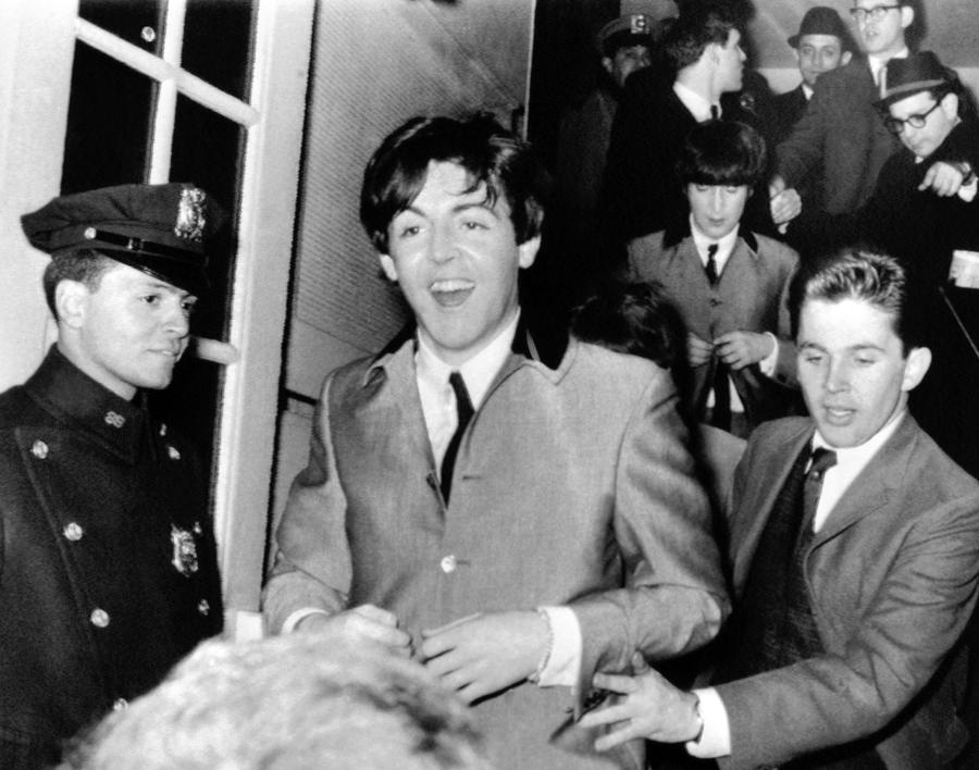 Read moreBeatle Paul McCartney flashes a smile as he rushes from New York's Carnegie Hall after two wild performances on February 12, 1964. Behind him is band mate John Lennon. #