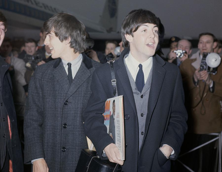Read moreThe Beatles arrive at London Airport, England, February 22, 1964, after their visit to the United States. In the foreground is Paul McCartney, carrying record albums under his arm (including "Um Um Um Um Um Um - The Best of Major Lance"), and George Harrison, left, talking to John Lennon. #