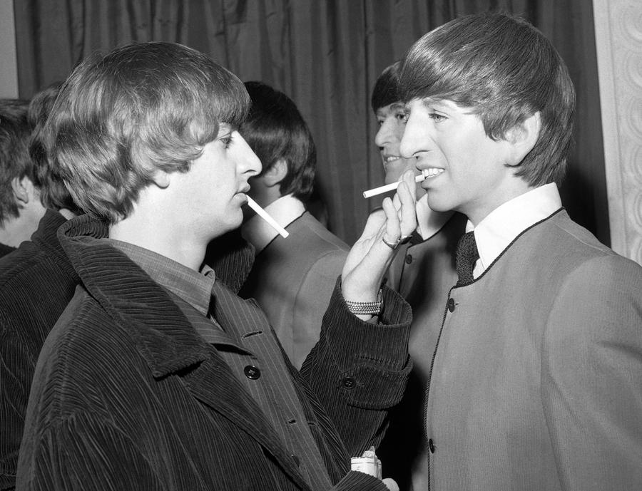 Read moreBeatle drummer Ringo Starr eases the pain on a wax likeness of himself with a cigarette, during the unveiling ceremony for four wax models of the Beatles at Madame Tussaud's Waxworks, in London, England, on April 29, 1964. #