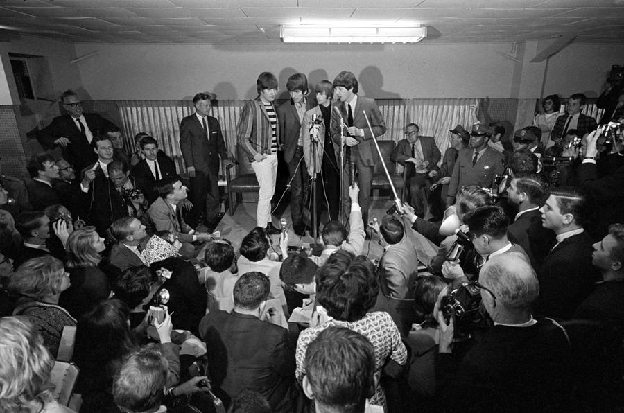Read moreThe Beatles, from left, Ringo Starr, George Harrison, John Lennon and Paul McCartney, in their New York hotel after their arrival in the U.S. on February 7, 1964. The British rock group, on their first American tour, was pelted with jelly beans and candy kisses by screaming teen-age fans. #