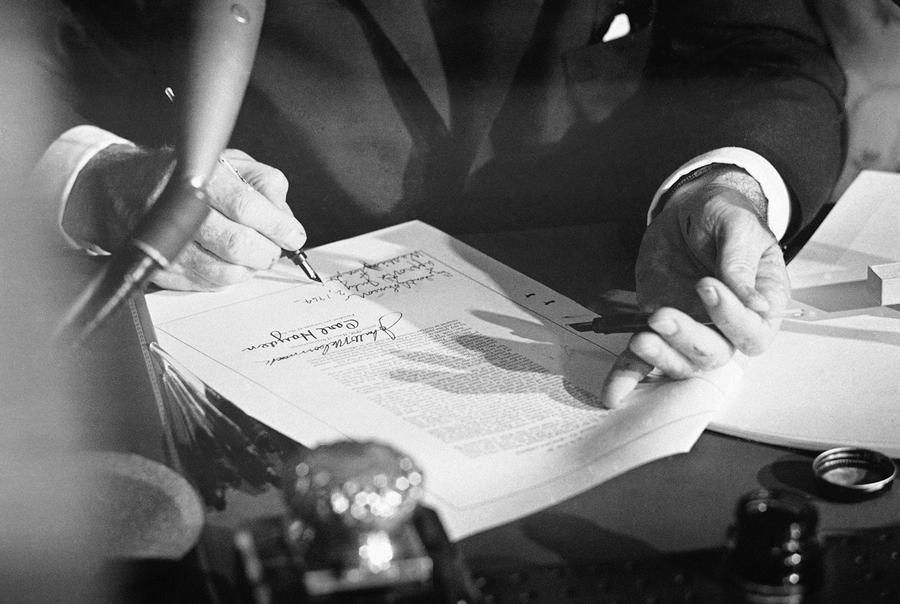 Read morePresident Lyndon Johnson signs the Civil Rights Bill in the East Room of the White House in Washington on July 2, 1964. The law outlawed discrimination based on race, color, religion, sex, or national origin, and ended unequal application of voter registration requirements and racial segregation in schools, at the workplace and by facilities that served the general public. #