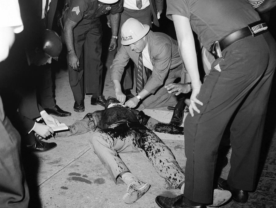 Read moreA black youth who was shot either in the neck or shoulder during a flare-up of racial violence in Jersey City, lies on a sidewalk while battle-helmeted policemen stand by to aid him on August 3, 1964. The youth, identified as Louis Mitchell, was among group of young people standing near a housing project who were hurling objects at the police. It was not determined how the youth was shot. At least one other resident was shot and several police officers and rioters were injured in the outburst. #