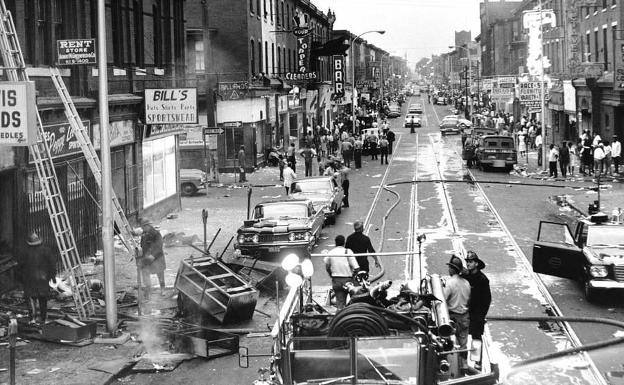 Read moreThis view looking west from 15th Street on Columbia Ave. shows Main Street was involved in rioting in the predominantly black area of North Philadelphia during the previous night and continuing into August 29, 1964. At left, firemen clear smoldering rubble from wrecked store. Demonstrators, bystanders and police line street in background. Looting was widespread and damage heavy. At least 50 persons were injured including 27 policemen. #