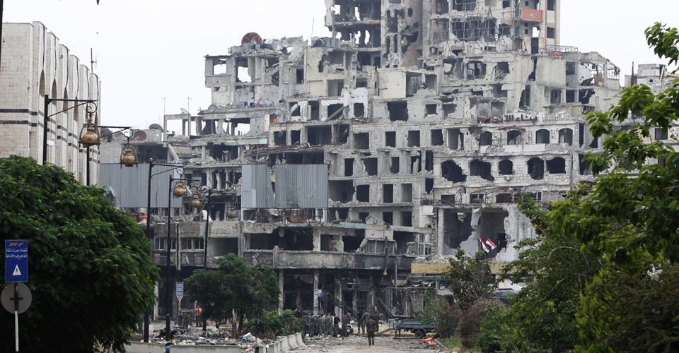 Read more(2 of 2: 2014) The clock tower in Homs, on May 8, 2014. Note the damaged and missing clock faces, the missing windows from the buildings in the background, and the missing air conditioning units. #