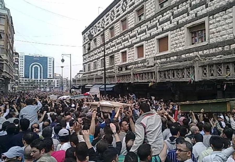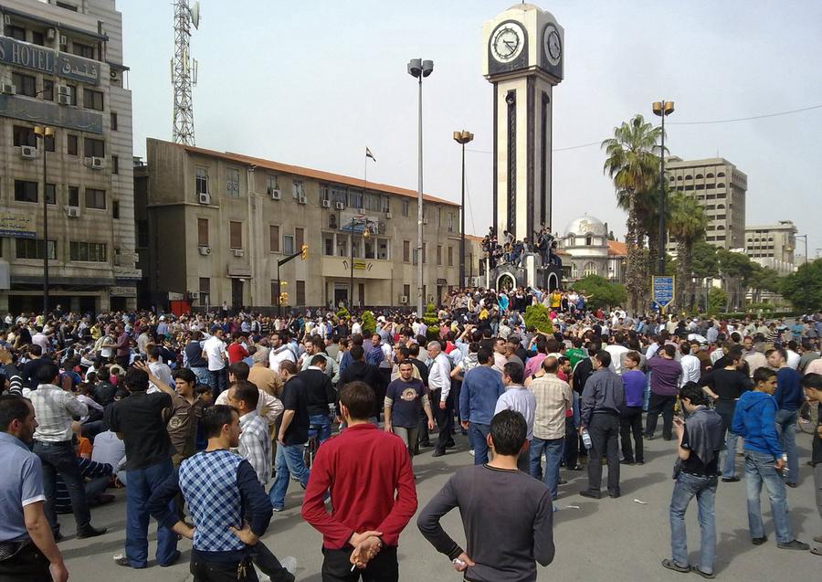 Read more(1 of 2: 2012) Demonstrators protest against Syria's President Bashar al-Assad after Friday prayers in Homs on January 6, 2012. Note the Khalid bin al Walid Mosque in the background. #