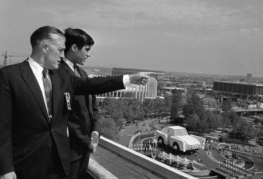 Read moreMichigan Governor George Romney and his son, Mitt, look out over the New York World's Fair grounds from the heliport after attending a Michigan breakfast at the Top of the Fair Restaurant. The governor and a large delegation from Michigan were in attendance for Michigan Day at the fair. At right is part of the Chrysler exhibit and behind them is the Ford exhibit. #