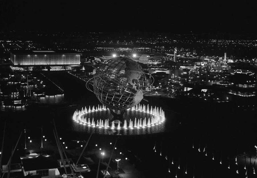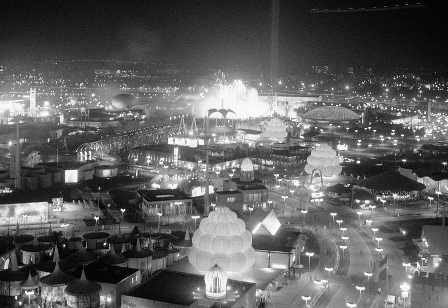 Read moreOne of the Brass Rail lunch bars at the World's Fair gives the appearance of a mass of balloons tied together on August 11, 1964. The towers at right are observation platforms, part of the New York State pavilion. #