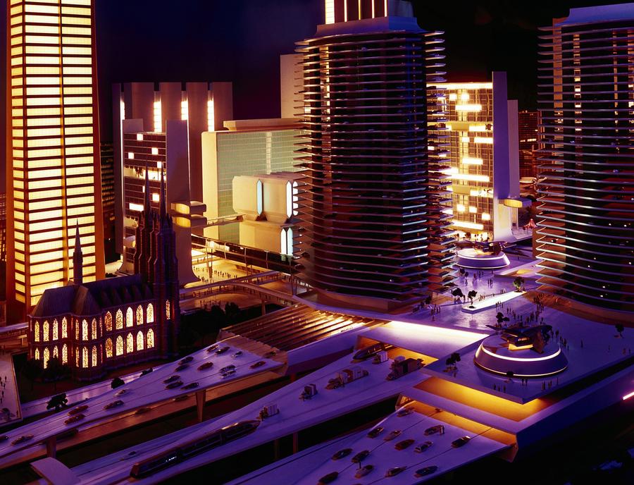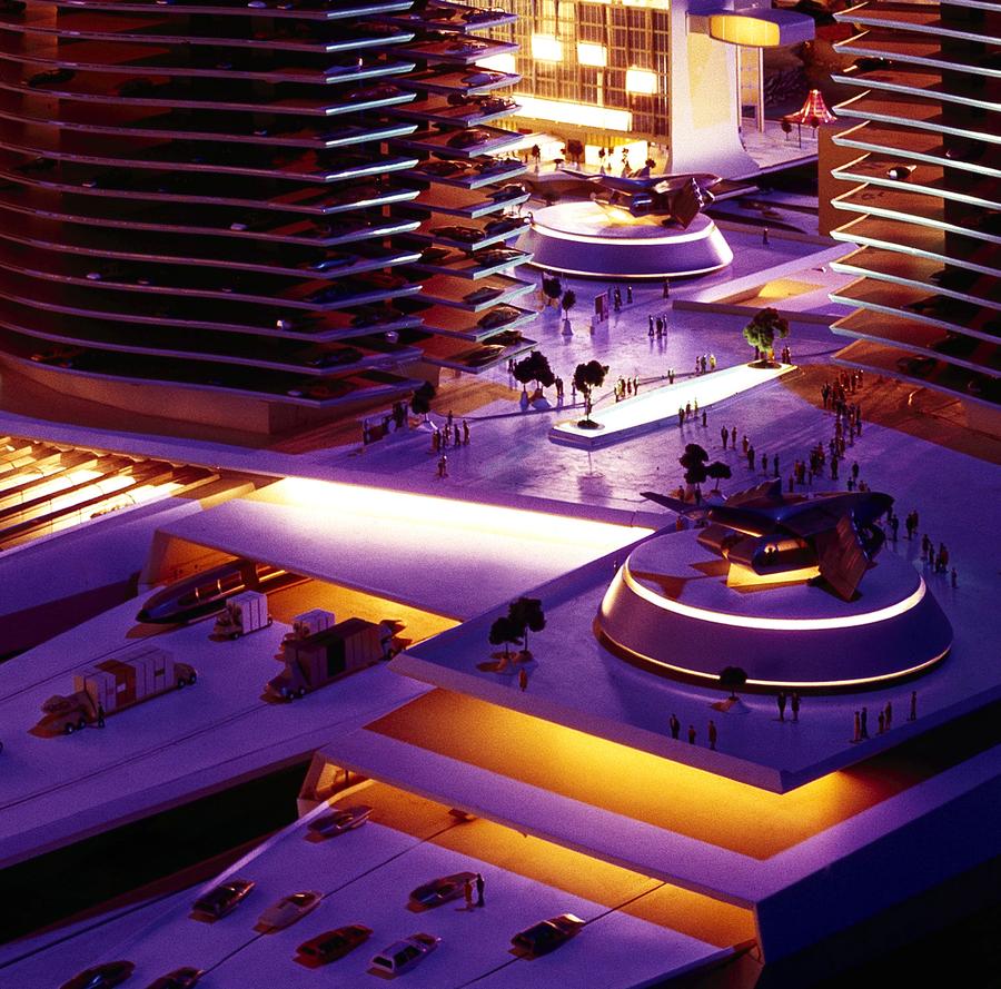 Read moreA detail of the previous photo of the city of the future, featuring automated roadways, landing ports for aircraft that can take off and land vertically, and 35-story parking garages, part of GM's Futurama exhibit at the World's Fair. #