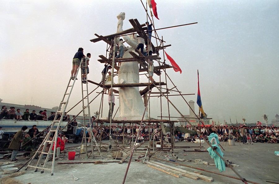 Read moreA student from an art institute plasters the neck of a "Goddess of Democracy", a 10-meter-tall statue erected in Tiananmen Square on May 30, 1989. The statue was unveiled in front of the Great Hall of the People (right) and the monument to the People's Heroes (center) to promote the pro-democracy protest against the Chinese government. From a statement released by the art students who created the statue: "Today, here in the People's Square, the people's Goddess stands tall and announces to the whole world: A consciousness of democracy has awakened among the Chinese people! The new era has begun!" #