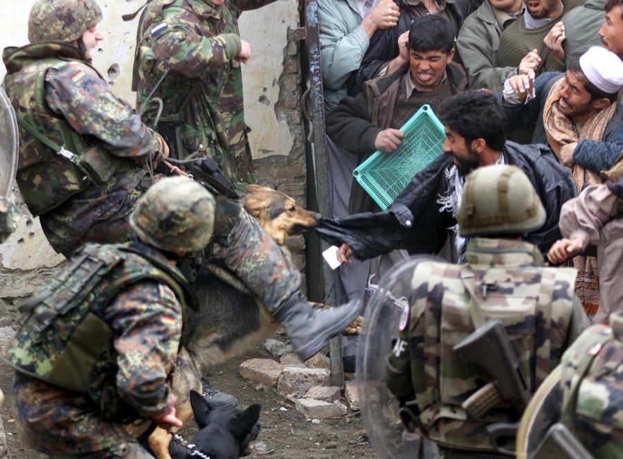 Read moreA dog belonging to a German soldier bites an Afghan during riots prior to a soccer match in Kabul's main stadium, on February 15, 2002. The match was to be a goodwill game between peacekeepers and an Afghan team when an overflow crowd began fighting their way through the gates, and Afghan police beat back the crowd with tree branches, strips of rubber, and the butts of their rifles, injuring at least 50 people, according to German peacekeeping medics. #