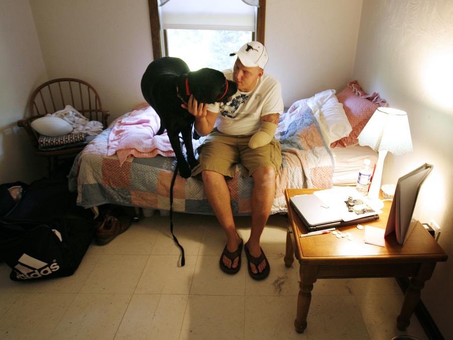 Read moreU.S. Army Specialist Joe Keck, who lost his left arm in a vehicle accident in Afghanistan in July 2006, and his new service dog Nolls sit on his bed at the residence at the National Education for Assistance Dog Service (NEADS) training facility in Princeton, Massachusetts, on June 25, 2007. #