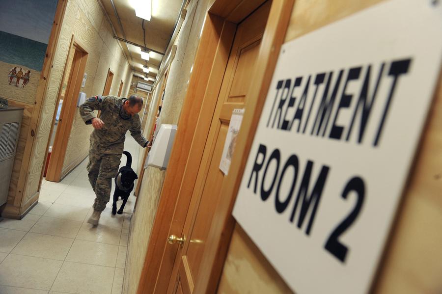 Read moreUS Army occupational therapist Sergeant Paul McCollough and Zeke, a therapy dog, at the Role 2 medical clinic in Kandahar military base, southern Afghanistan, on August 19, 2011. Zeke, a five year old labrador retriever who has a rank of Sergeant First Class, is trained to help soldiers struggling with stress and war trauma. Therapy dogs were first introduced in the war zone in Iraq in 2007 to replicate the psychological benefits the troops gain from US homeland care facilities employing specially trained dogs. #