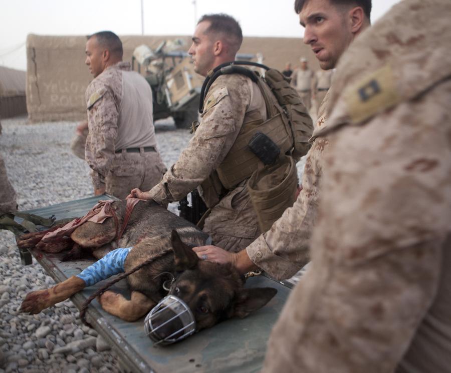 Read moreU.S. Marines from 1st Battalion, 5th Marines, Regimental Combat Team 8, carry Drak, an injured bomb-tracking dog, to an awaiting helicopter at Forward Operating Base Jackson on September 8, 2011. Both Drak and his handler, Sgt Kenneth A. Fischer, were flown out of the country for surgery and recovery. Eventually, in line with military custom, Fischer will adopt Drak and take him home. #