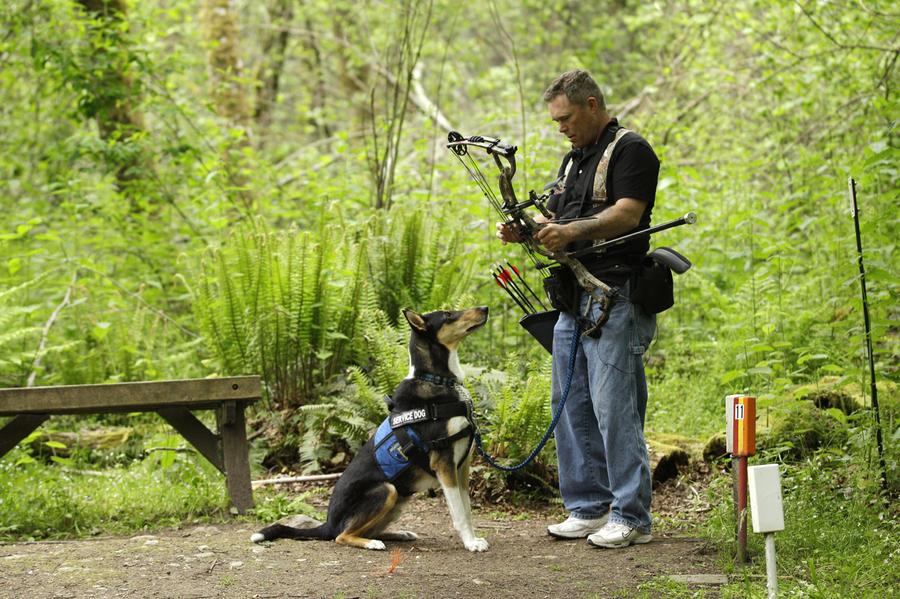 Read moreU.S. Army Spc. Mike Ballard stands with Apollo, his service dog, during an archery shooting session, on May 17, 2012, in Puyallup, Washington. Ballard says his dog helps him get through the worst symptoms of the post-traumatic stress disorder that are a remnant of an explosion in Afghanistan that ended his career as an Army medic. #