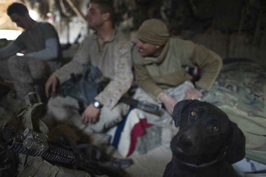 Read moreA military working dog looks at the camera as US Marines from 1st Battalion, 8th Marines clean their weapons before a patrol outside new Mirage base, on the south of Musa Qala District, Helmand province, on February 4, 2011. #