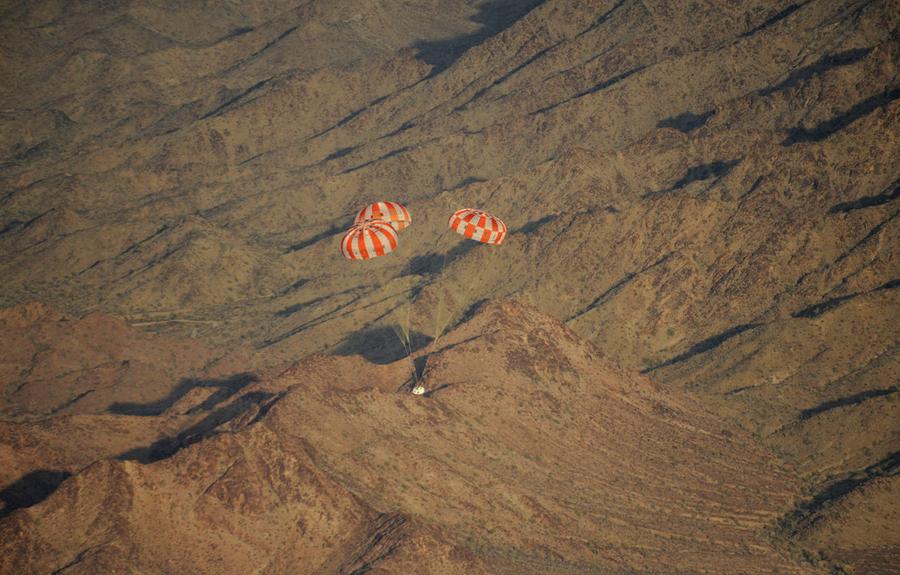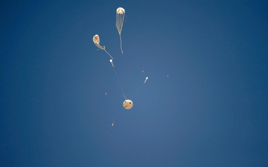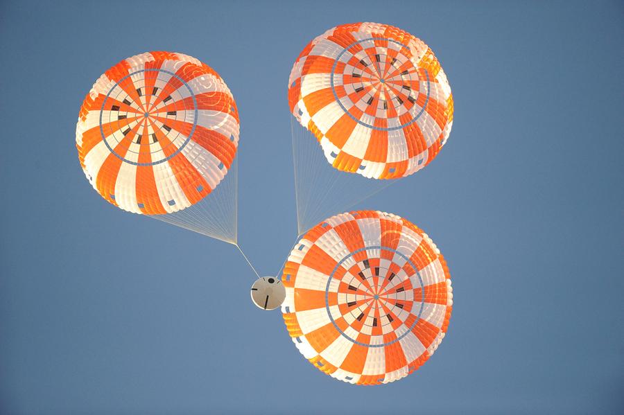 Read moreThree 300-pound main parachutes gently lower a mockup Orion capsule to the ground during a test at the U.S. Army Yuma Proving Ground in Arizona, on December 20, 2012. The Orion Multi-Purpose Crew Vehicle (MPCV) is NASA's next manned spacecraft, currently in development, with an unmanned orbital test flight scheduled for December 2014. #