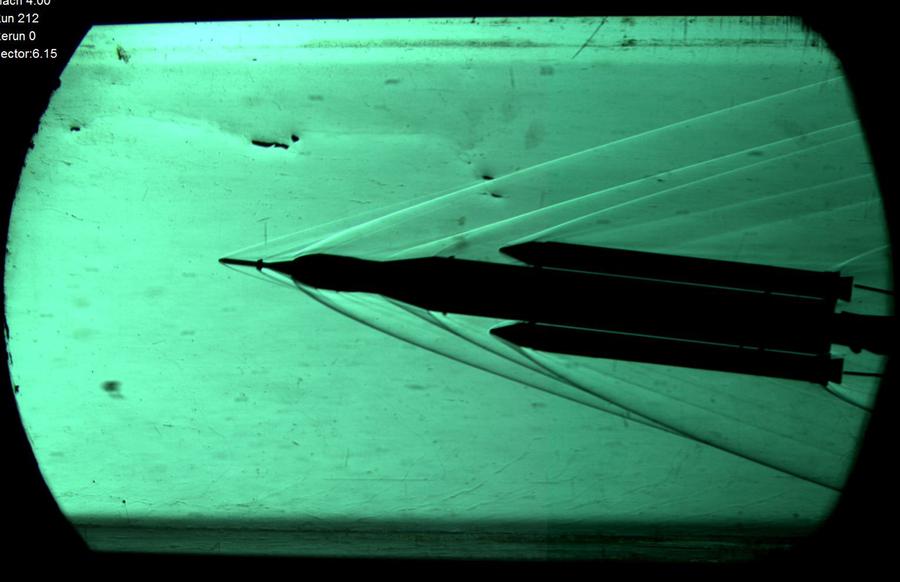 Read moreThe 70-metric-ton configuration of the SLS rocket, designed to carry the Orion spacecraft, is tested in the Trisonic Wind Tunnel at NASA's Marshall Space Flight Center. This view uses special cameras and a deflection of light directed through the windows in the tunnel to show the shadows of airflow as it changes angles at high speeds, helping visualize the various intense pressures of atmosphere on the model, on August 23, 2012. #