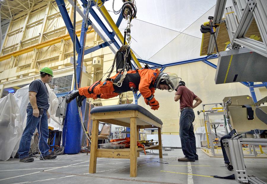 Read moreNASA Astronaut Rex Walheim participates in an evaluation of the Advanced Crew Escape Suit (ACES) in the Active Response Gravity Offload System (ARGOS) at the Johnson Space Center, on June 5, 2012. The modified ACES suit is fully integrated with Orion life support systems and will be used by crews for Ascent and Entry as well as light Extra Vehicular Activity (EVA) duties. The ARGOS system allows an astronaut to be suspended and have full freedom of motion, simulating a microgravity environment. During this test, the astronaut was evaluating the amount of dexterity the suit would provide for various tasks including translating across handrails, working with tools, and entering a spacecraft hatch. #