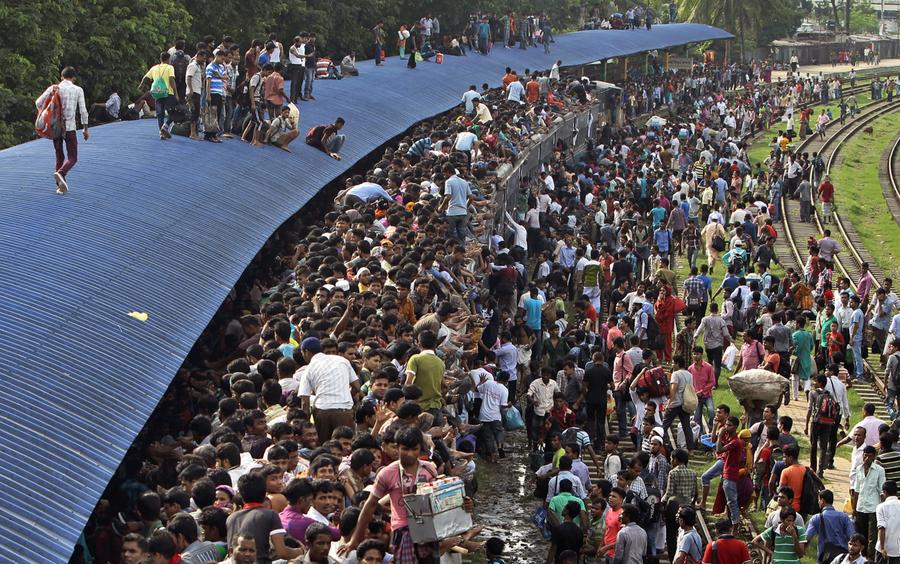 Read moreBangladeshi Muslims sit on the roof of an overcrowded train as others wait as they head to their homes ahead of Eid al-Fitr at a railway station in Dhaka, Bangladesh, Sunday, July 27, 2014. #