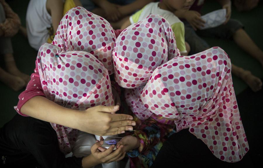 Read moreHui Muslim girls share a smartphone as they attend a graduation for an Islamic studies course during the holy month of Ramadan at a mosque on July 22, 2014 in Sangpo, Henan Province, China. As part of a tradition dating back to the late 19th century and unique to China's 10 million Hui Muslims female congregations are led by female Imams in the women's only mosques of northwest China. Though able to teach and lead prayers for women, they are forbidden from overseeing funeral rituals or washing male corpses before burial. #
