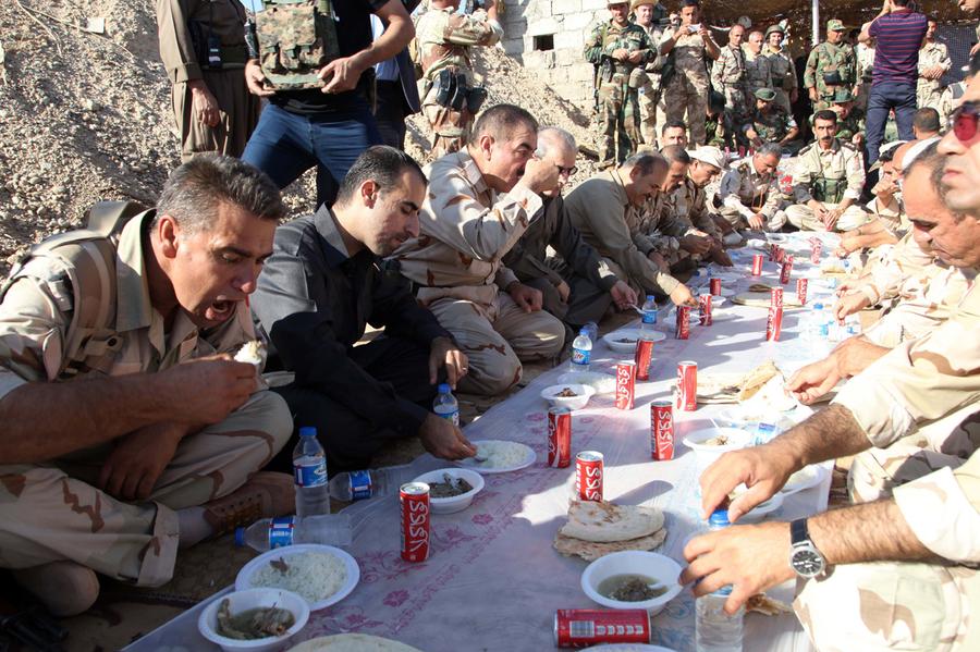 Read moreKirkuk provincial Governor Najm al-Din Karim has lunch with Kurdish peshmerga forces in the district of Daquq, 45 kms south of the multi-ethnic northern Iraqi city of Kirkuk on July 28, 2014 on the first day of the Muslim Eid festival ending the month-long fast of Ramadan. Islamic State jihadists who overran swathes of northern and western Iraq last month have not taken Kirkuk. #