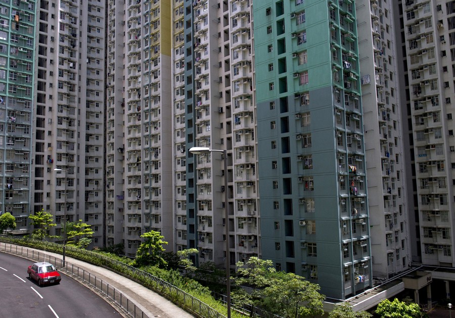 Read moreThis photo taken on July 12, 2014 shows a taxi driving past a large residential complex in Hong Kong. Housing prices in the southern Chinese city have roughly doubled since 2009, with prices being pushed up by buyers from mainland China. #