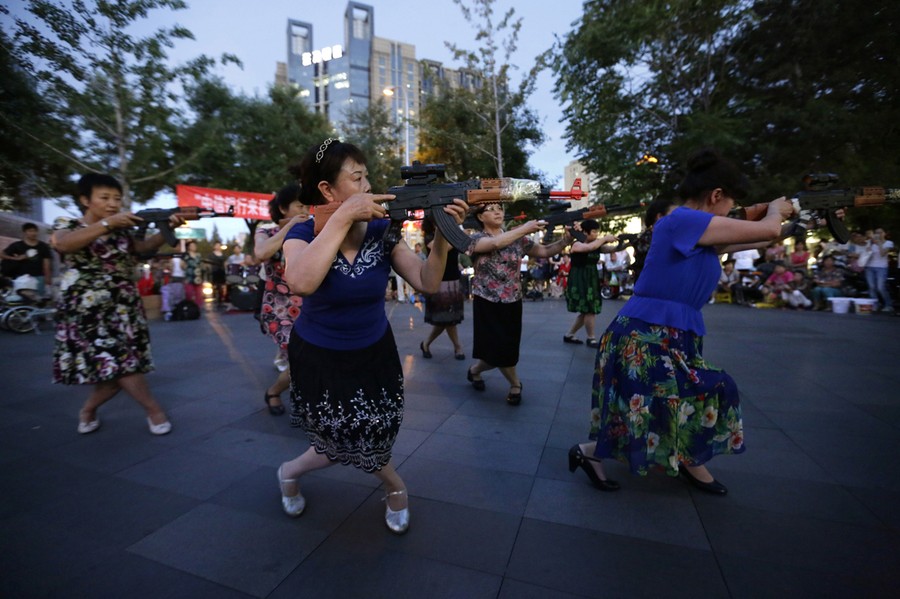 Read moreChinese women holding toy guns dance to a revolutionary song as part of their daily exercise at a square outside a shopping mall in Beijing, on June 27, 2014. About 30 local residents formed this "Nanguan" art group that enjoys performing and dancing to revolutionary songs as part of their nightly fitness activity. #
