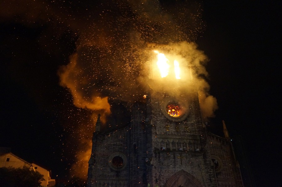 Read moreThe Jiangbei Cathedral burns on July 28, 2014 in Ningbo, Zhejiang Province. A fire destroyed one of China's oldest cathedrals in the east China city of Ningbo, with no casualties reported. The cathedral was built in the Jiangbei District of Ningbo,Zhejiang Province by a French bishop in 1872. The church, a landmark of Ningbo, is a key cultural relic under state-level protection for its great historical and architectural value. #