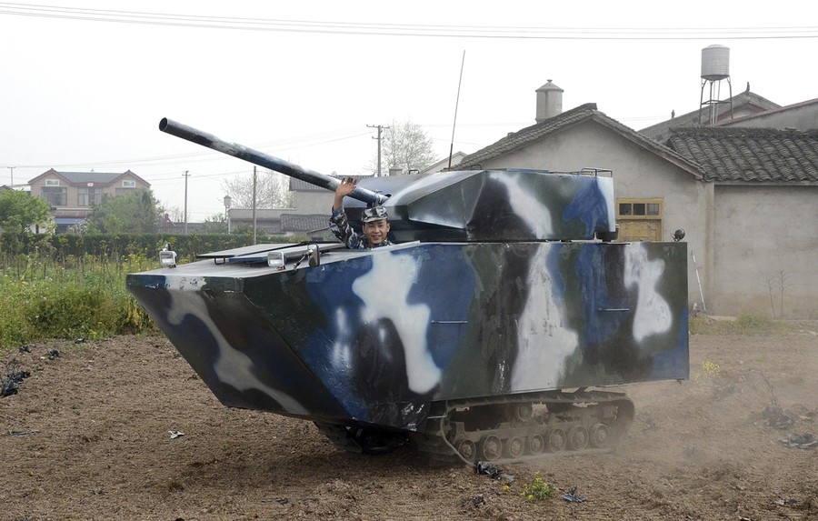 Read moreJian Lin, a 31-year-old farmer who used to serve in the Chinese navy, waves in his home-made replica of a tank during a trial run, at a village in Mianzhu, Sichuan province, on April 9, 2014. The tank, which measures 4.5m long (15 feet), 1.6m wide (5 feet) and 2.1m high (7 feet), weighs nearly 3 tons and cost Jian about 40,000 yuan ($6,450) to make. #