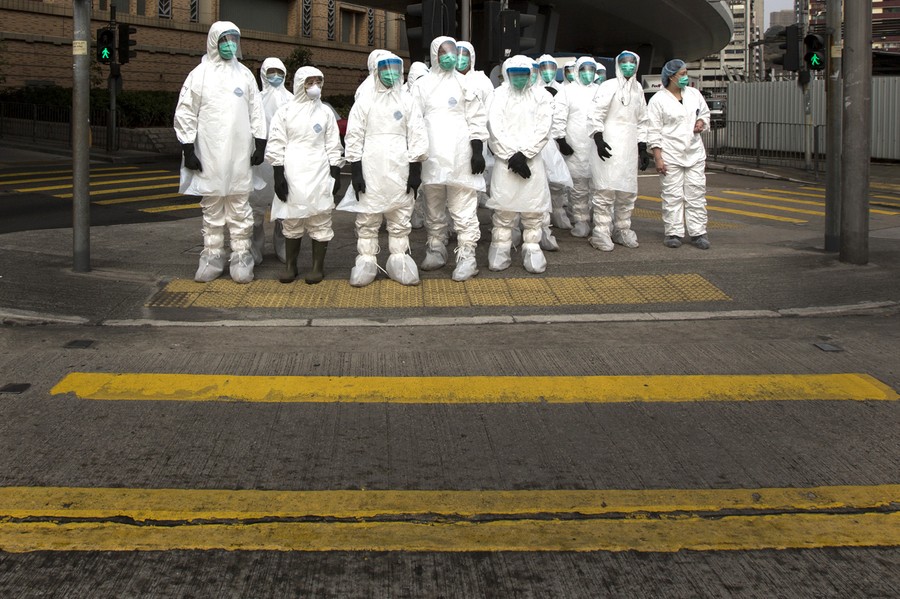 Read moreHealth officers in full protective gear wait to cross a road near a wholesale poultry market in Hong Kong on January 28, 2014. Hong Kong culled 20,000 chickens and suspended imports of fresh poultry from mainland China for 21 days after the discovery of the H7N9 bird flu virus in a batch of live chicken from the southern province of Guangdong. #