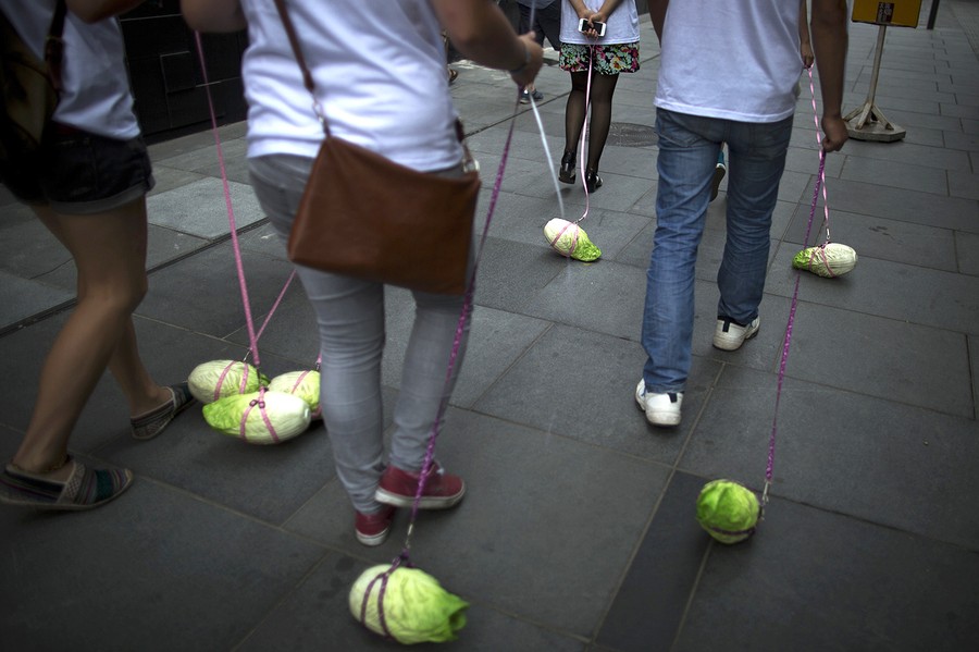 Read moreYoung people drag fake cabbages as part of a performance titled "Walk the cabbage", designed to question restricted daily activities and encourage thoughts on freedom in Beijing, on June 24, 2014. #