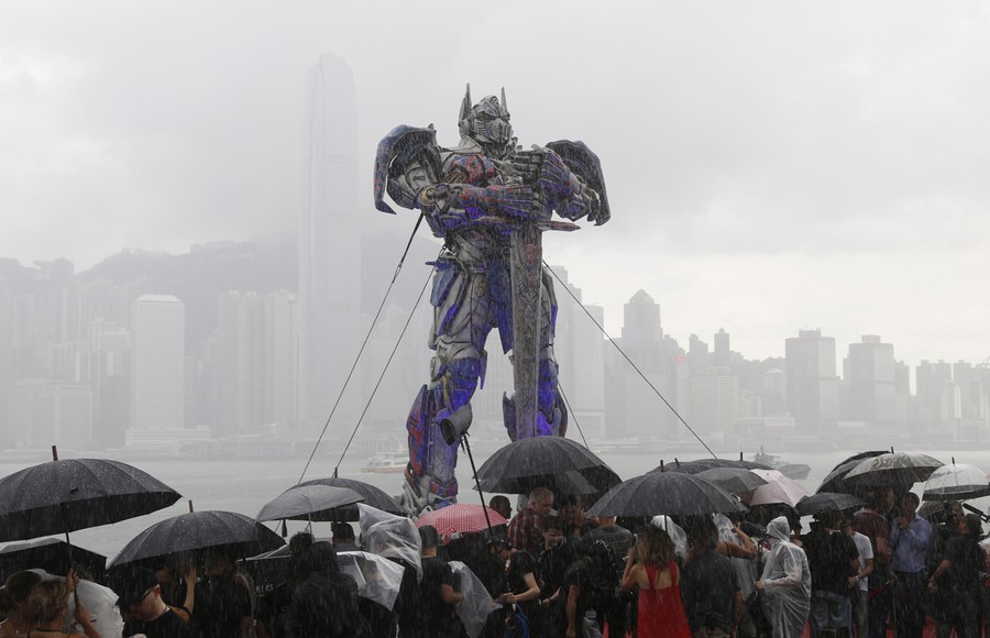 Read morePeople duck and hide themselves under umbrellas as a giant figure of Optimus Prime from the movie "Transformers 4: Age of Extinction" stands in the heavy rain for its world premiere in Hong Kong Thursday, June 19, 2014. The film grossed $317 million in China alone - setting the record for highest-grossing movie in China to date. #