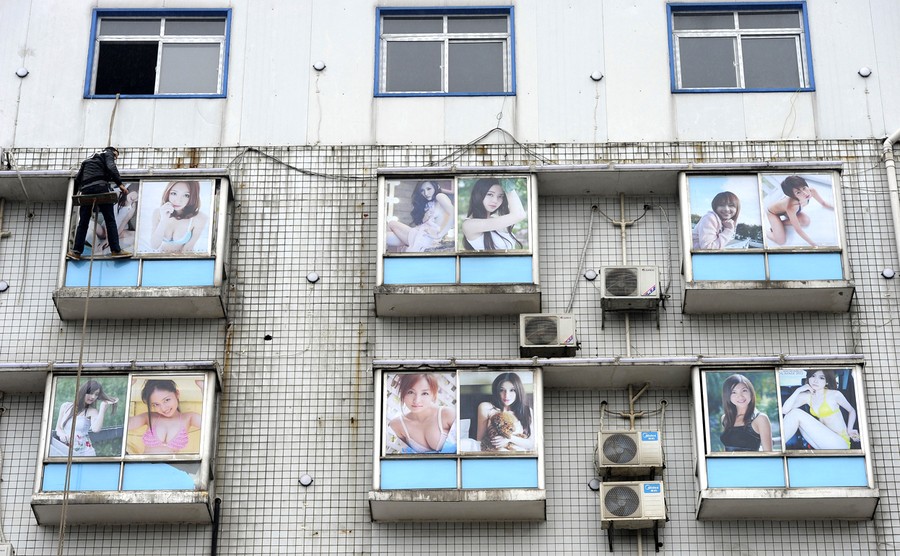Read moreA man takes down pin-up photos of women covering the windows of a building housing a bathhouse in Changsha, Hunan province, on January 10, 2014. The photos, over 50 in total, were taken down after exposure on the Internet and the intervention of the city administration department. #