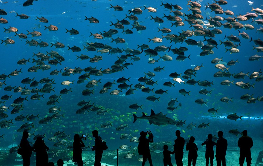 Read moreVisitors look at fish in the aquarium inside the Chimelong Ocean Kingdom in Zhuhai on April 29, 2014. The park which claims to be the world's largest ocean theme park was built at an estimated cost of USD3.3 billion and opened in March of this year. #