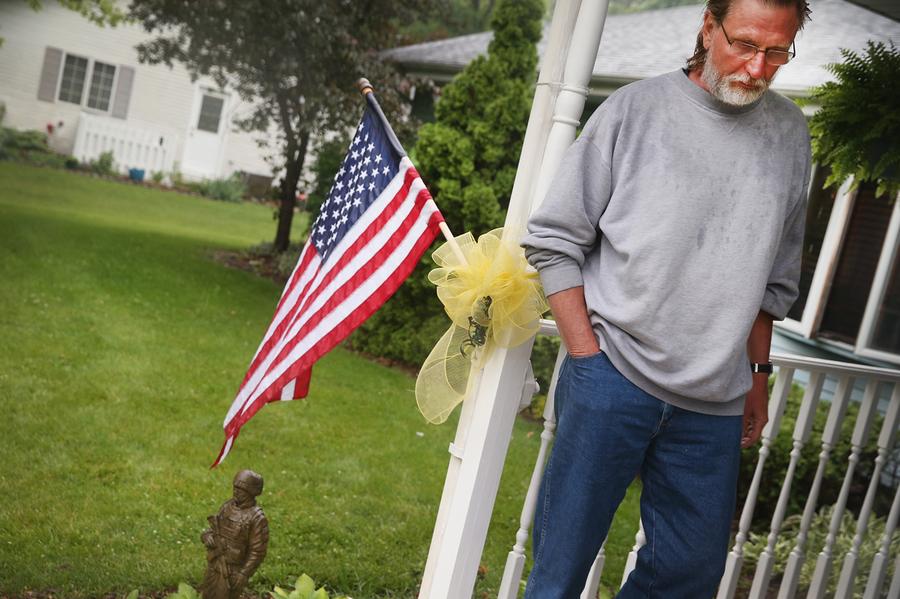 Read moreJack Winter stands alongside a flag, a statue of a soldier and a yellow ribbon that decorate the front of his sister's home as family and friends drop by to help her grieve the death of her son Aaron on June 10, 2014 in Mokena, Illinois. #