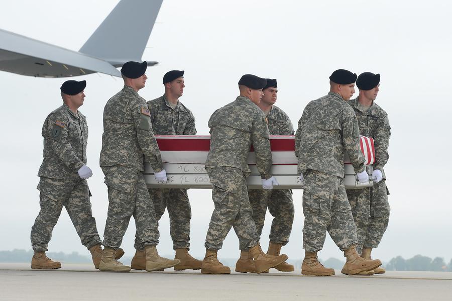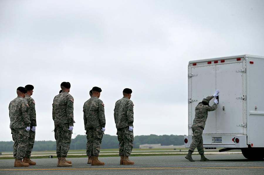 Read moreA U.S. Army carry team transfers the remains of Pfc Aaron S. Toppen, of Mokena, Illinois, during a dignified transfer at Dover Air Force Base, Delaware, on June 12, 2014. #