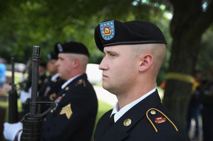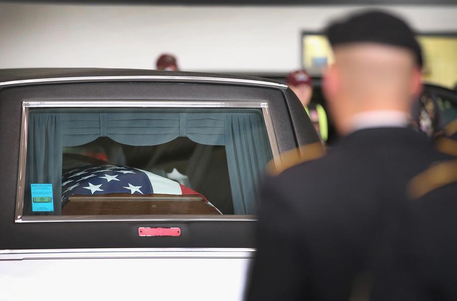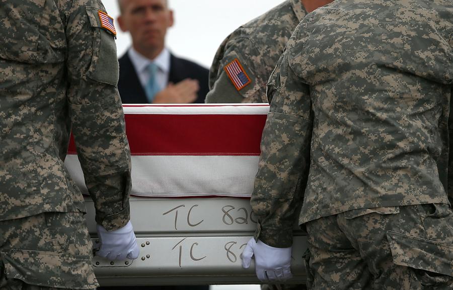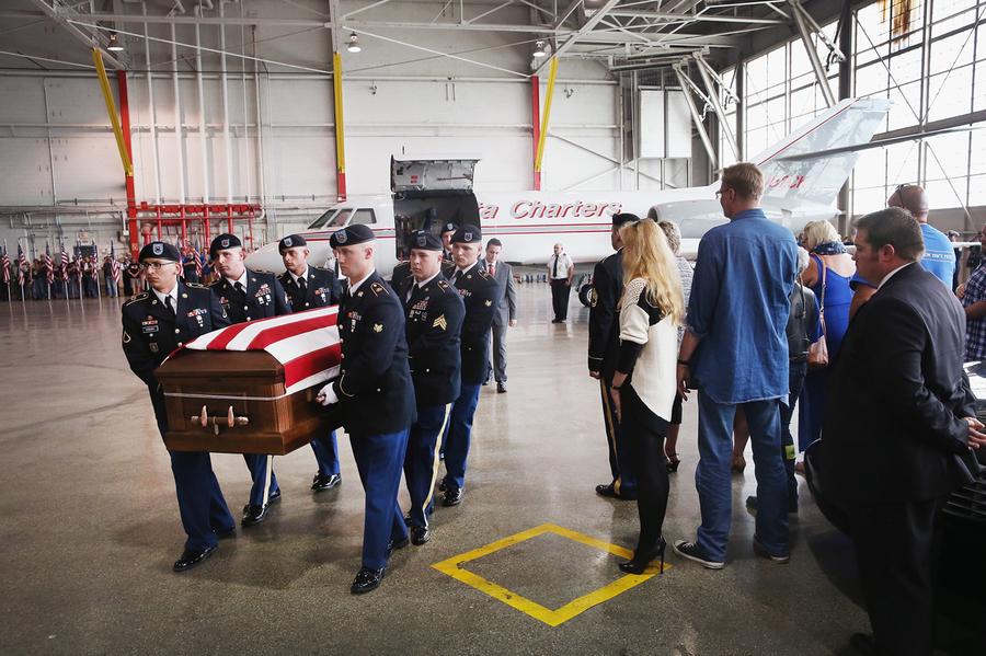 Read moreSoldiers carry the remains of Army Pfc. Aaron Toppen past family members to a hearse after they arrived at Midway Airport on a charter aircraft from Dover Air Force Base on June 21, 2014 in Chicago, Illinois. #