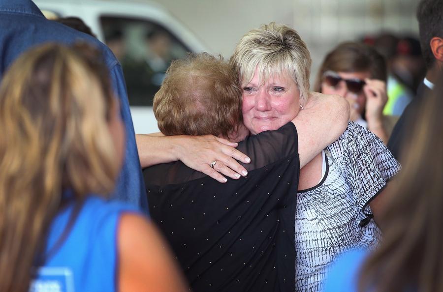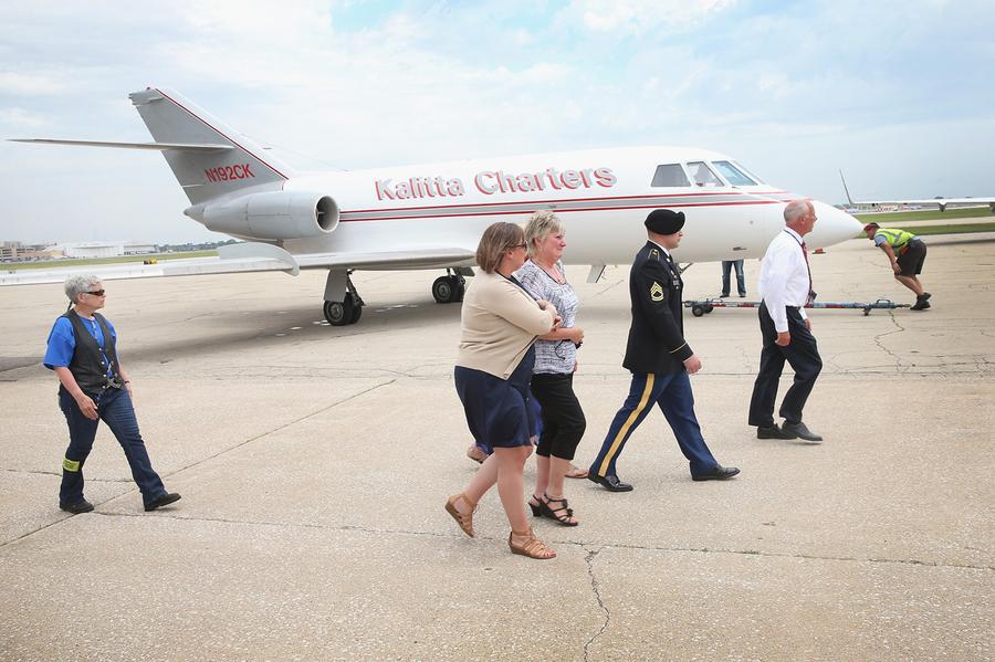 Read moreAmy Toppen (2nd from Left) holds her mother Pamela Toppen as they walk alongside the aircraft carrying the remains of Army Pfc. Aaron Toppen, their brother and son, after its arrival at Midway Airport on June 21, 2014 in Chicago, Illinois. Toppen, 19, was killed alongside four other American Soldiers and an Afghan soldier in a friendly fire airstrike during a firefight earlier this month in Afghanistan. The remains were being returned for burial in his hometown of Mokena, Illinois. #