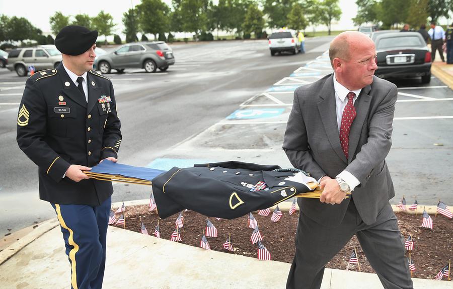 Read moreU.S. Army Sgt. 1st Class Dan Wilson (left) and funeral director Ed Hickey carry the uniform of Pfc. Aaron Toppen, which will be displayed next to the closed casket during a visitation service at Parkview Christian Church on June 23, 2014 in Mokena, Illinois. #