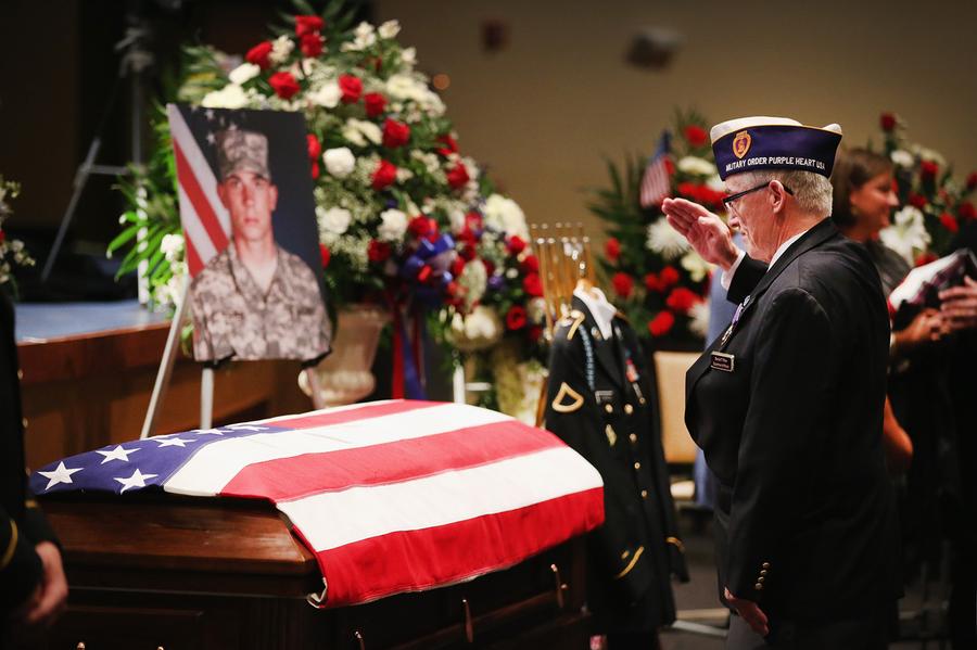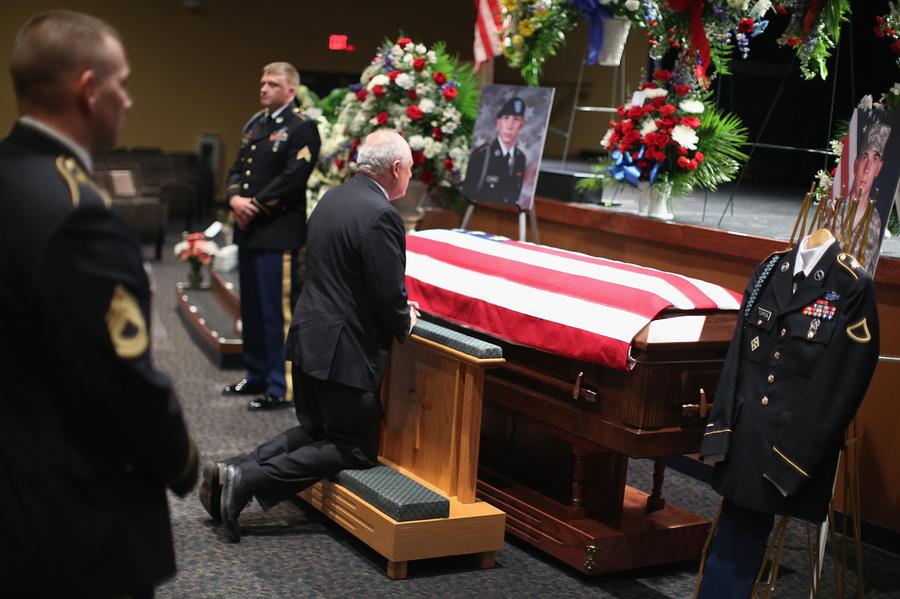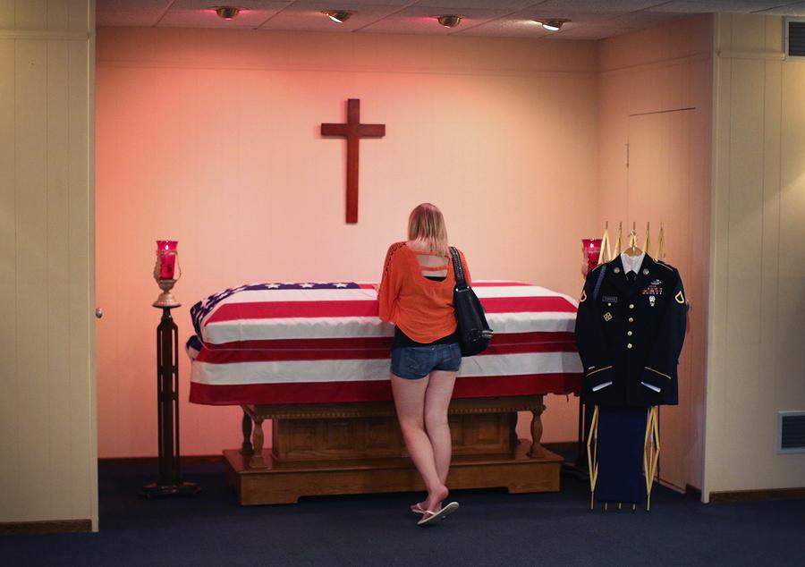 Read moreU.S. Army Sgt. Brant Sharp waits outside a chapel at Vandenberg Funeral Home as family members spend a quiet moment with the remains of Pfc. Aaron Toppen on June 22, 2014 in Mokena, Illinois. Sharp, who is stationed with Toppen, is assigned to escort his remains until he is buried on Tuesday. #