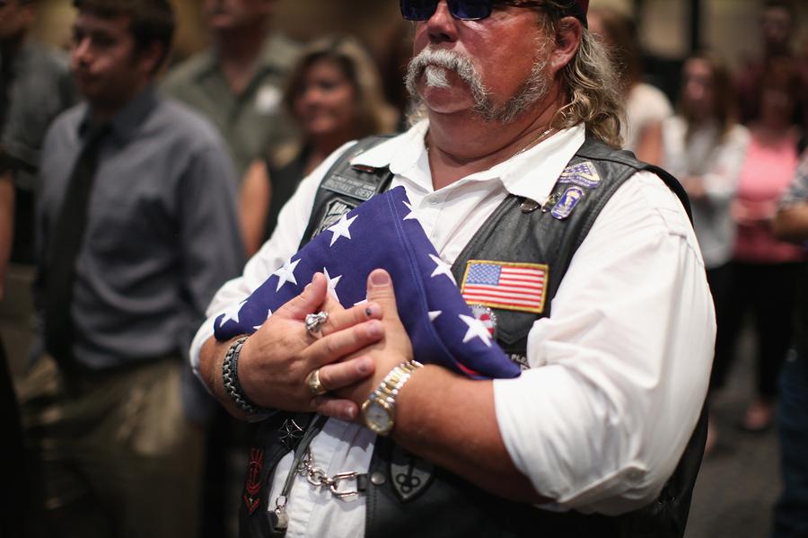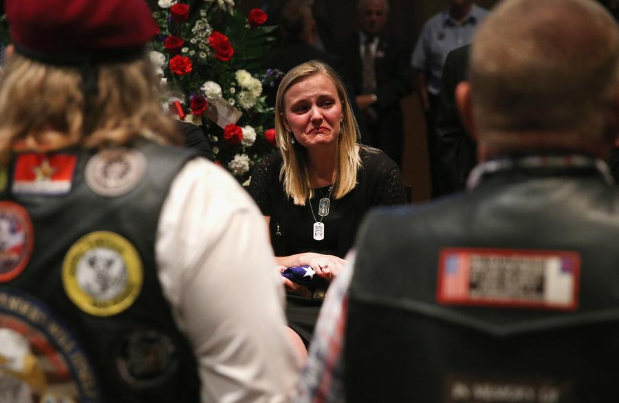 Read moreJackie Rozek fights back tears after she is presented with a flag by members of the Patriot Guard Rider to honor her boyfriend, U.S. Army Pfc. Aaron Toppen during a visitation at Parkview Christian Church on June 23, 2014. #