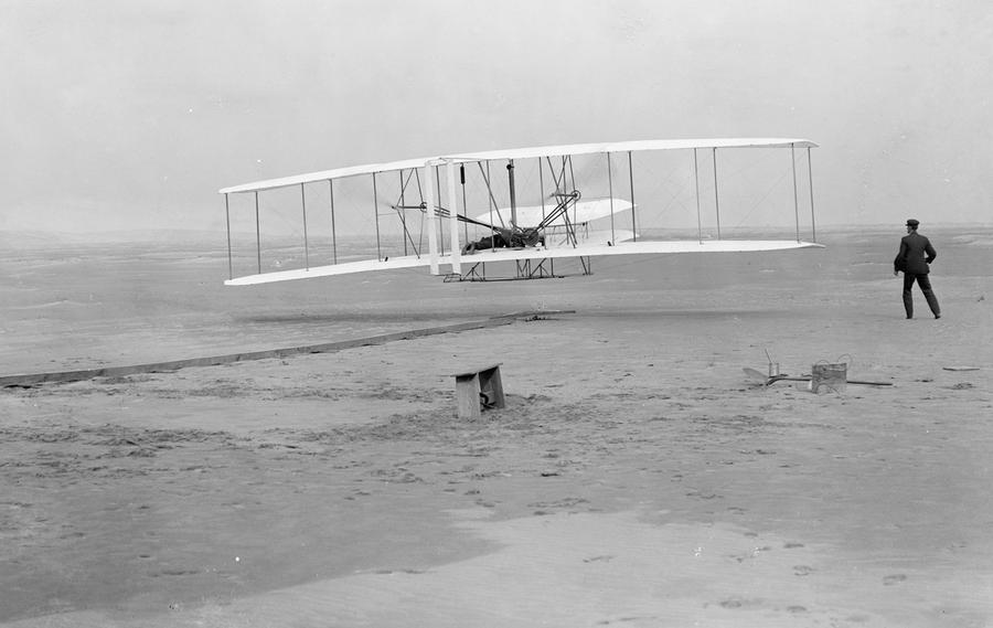 Read moreFirst flight: 120 feet in 12 seconds, on December 17, 1903. This photograph shows man's first powered, controlled, sustained flight. Orville Wright at the controls of the machine, lying prone on the lower wing with hips in the cradle which operated the wing-warping mechanism. Wilbur Wright running alongside to balance the machine, has just released his hold on the forward upright of the right wing. The starting rail, the wing-rest, a coil box, and other items needed for flight preparation are visible behind the machine. Orville Wright preset the camera and had John T. Daniels squeeze the rubber bulb, tripping the shutter. #