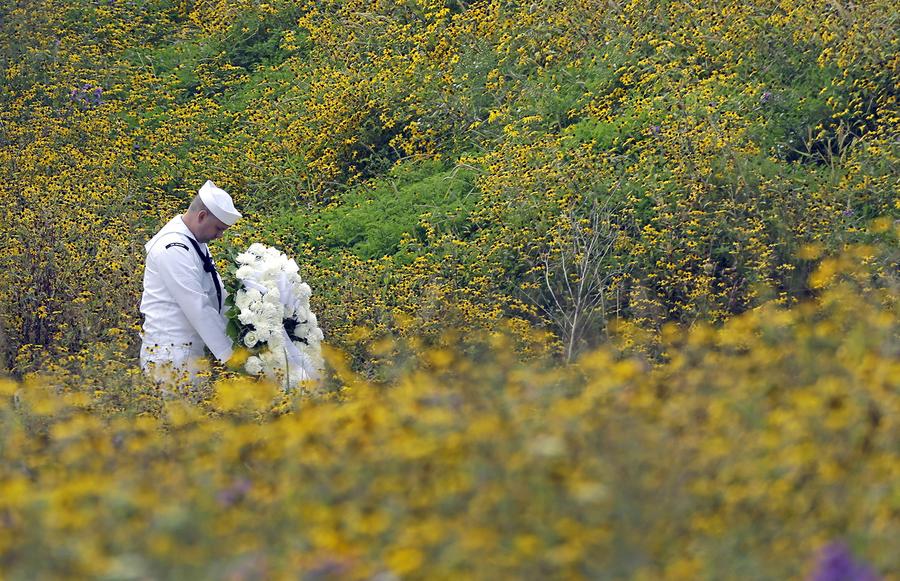 Read moreNavy Quartermaster Matthew Konchan of Johnstown, Pennsylvania, stands in a field of black-eyed Susan as he waits to participate in a wreath-laying ceremony with Secretary of the Interior Sally Jewell during a memorial service at the Flight 93 National Memorial on September 11, 2013 in Shanksville. #