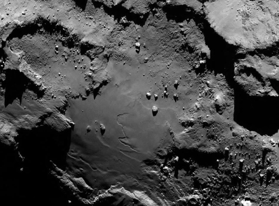 Read moreClose-up detail focusing on a smooth region on the base of the 'body' section of comet 67P/Churyumov-Gerasimenko, taken by OSIRIS on August 6, 2014. The image clearly shows a range of features, including boulders, craters and steep cliffs. The image was taken from a distance of 80 miles (130 kilometers) and the image resolution is 8 feet (2.4 meters) per pixel. #