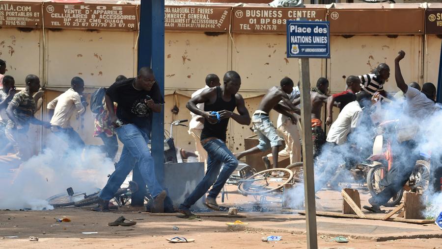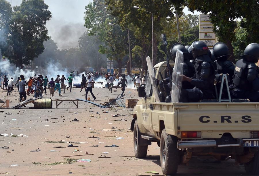 Ouagadougou, the capital of Burkina Faso, has been the scene of violent protests today, as demonstrators vent their anger over a proposal to extend President Blaise Compaore's 27-year rule. The storming of the parliament building today marked the culmination of several days of demonstrations. A reported 1,500 protesters ransacked offices and set buildings, documents, equipment, and vehicles ablaze. Security forces attempted to control the crowds using tear gas and live rounds. Emergency services said at least three protesters have been shot dead and several others wounded so far. Ouagadougou airport is now closed, and state TV is off the air. The violent reaction has led the government to scrap the planned presidential term extension, but opposition protesters are now calling for Compaore's resignation.