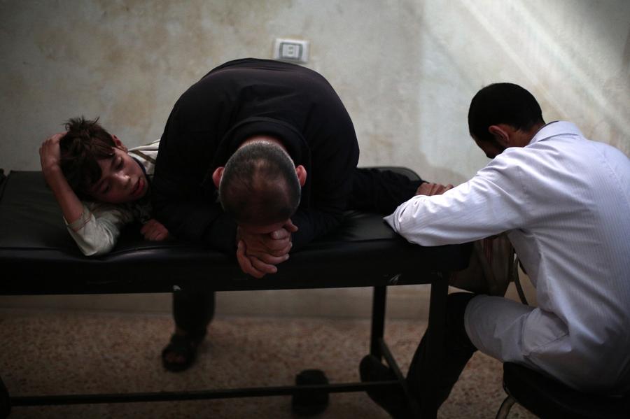 Read moreMustafa's father (center) cries hearing his son suffering as he helps a doctor to stretch the boy's legs at a physical therapy center on November 6, 2014 in Eastern al-Ghouta, a rebel-held region outside Syria's capital of Damascus. Mustafa, 13, had his legs' tendons cut after he was injured in an airstrike four months before. Medical care in Syria has been disintegrated due to the ongoing conflict that erupted in March 2011. #