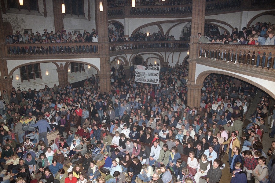 Read moreA general view of the overcrowded East Berlin Gethsemane Church on October 12, 1989. About 1,000 East Germans took part in a prayer service here for imprisoned pro-democracy protesters. The church was the focus of protests in the final days of the wall. #