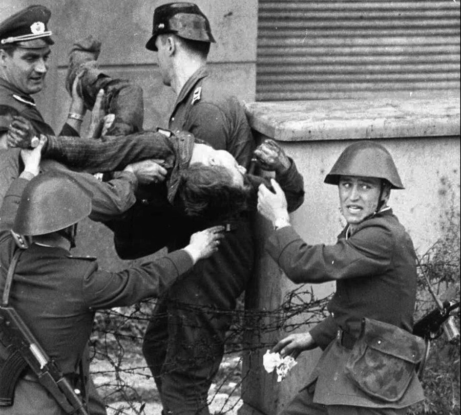 Read moreDying Peter Fechter is carried away by East German border guards who shot him down when he tried to flee to the west in this August 17, 1962 photo. Fechter was lying 50 minutes in no-man's land before he was taken to a hospital where he died shortly after arrival. #
